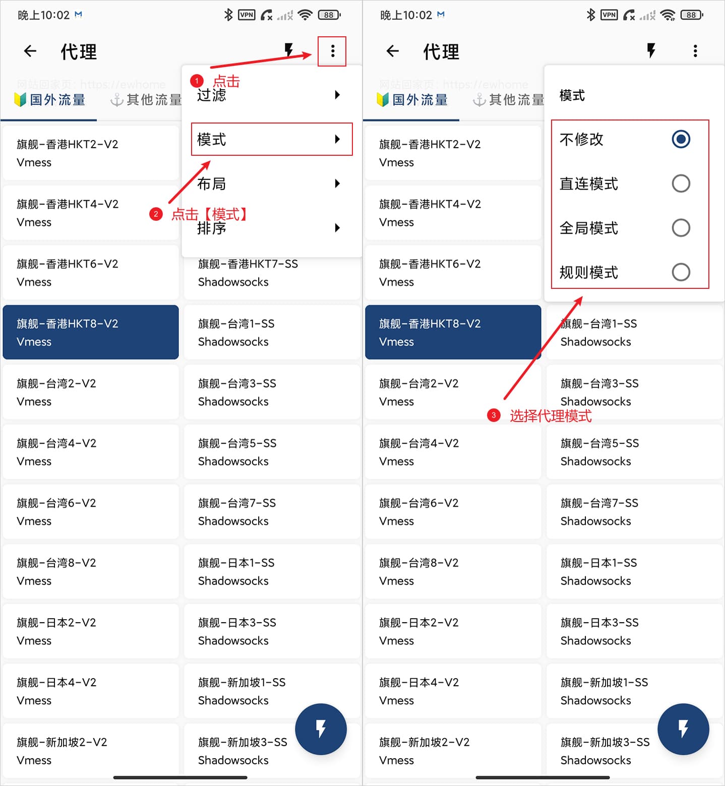 在上图中的代理页面,点击左上角的图标,在弹出的窗口中点击模式,即可切换代理模式,如下图所示。