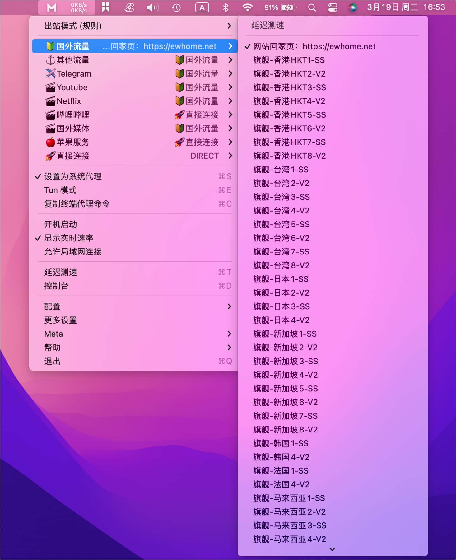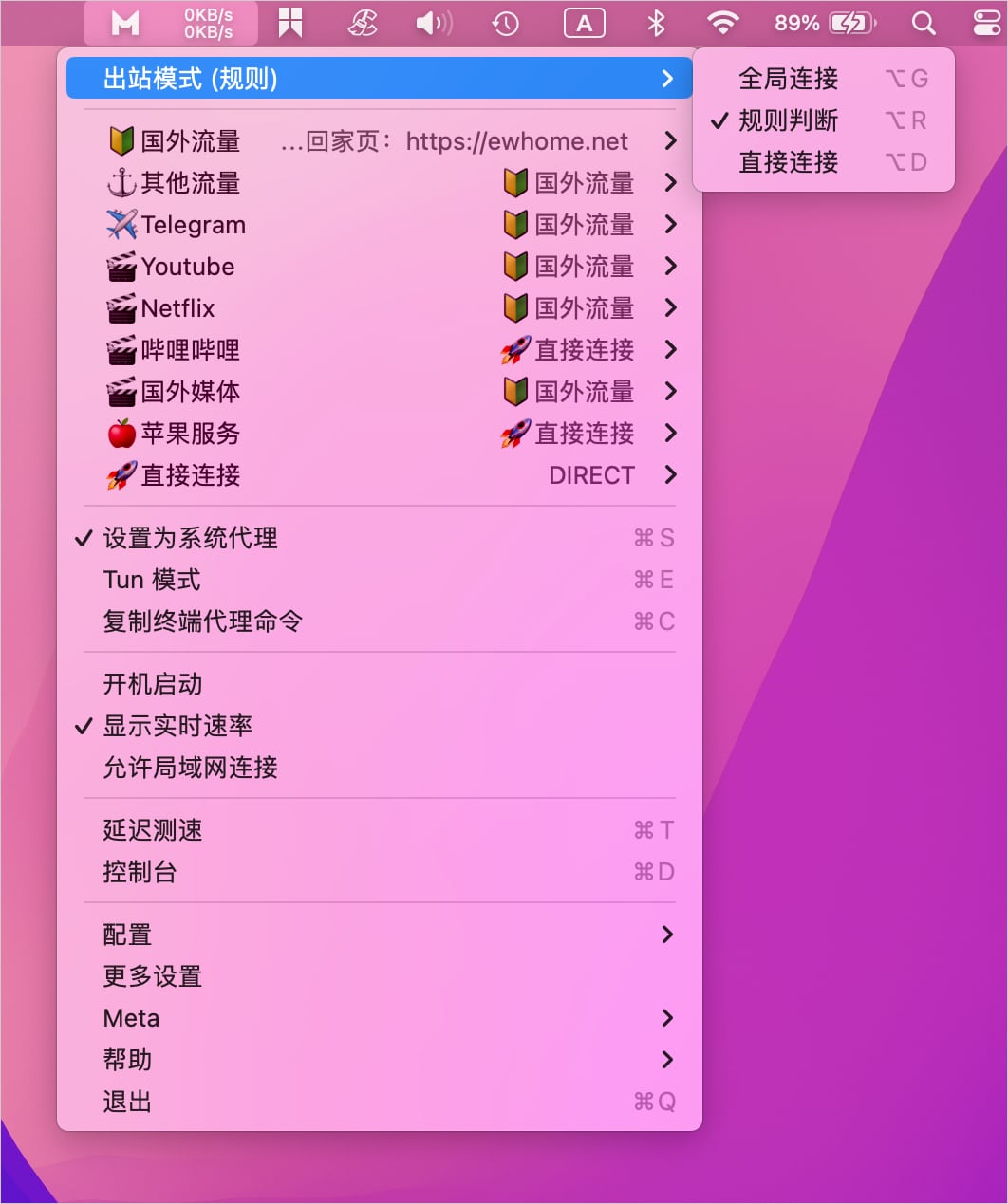点击状态栏中的小猫咪软件图标,打开【主菜单】可以看到出站模式下有国外流量等选项,选择任意节点即可选择系统代理,如下图所示。